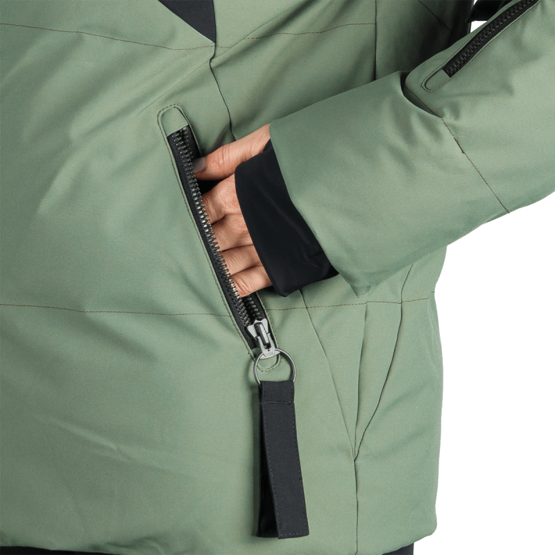 Bunda ASHTYN je plná technických detailov, ktoré zlepšujú jej využiteľnosť na svahu. Obsahuje zipsovateľnú kapucňu pre nastaviteľnú ochranu, zipsy YKK® pre vyššiu odolnosť a zvýšený golier pre extra teplo. Elastické manžety s integrovanými otvormi na palce zabezpečujú pevné utesnenie, a snehový pás v páse zabraňuje prenikaniu snehu pri dynamickom pohybe. Hodnotenie vodoodolnosti 5 000 mm a priedušnosti 5 000 g/m²/24h zaručuje vyváženú ochranu pred počasím a aktívny komfort.