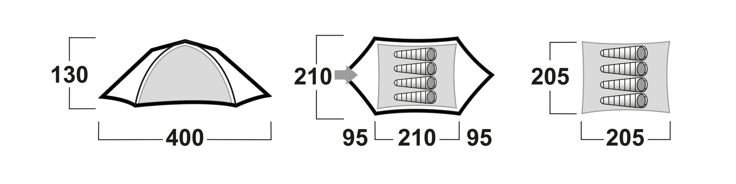 Rozmery: (Š × D × V ) 210 x 400 x 130 cm Konštrukcia: dvojplášťový samonosný stan s vnútornou konštrukciou |