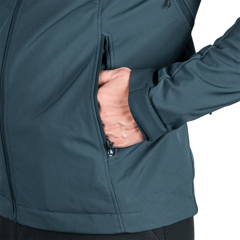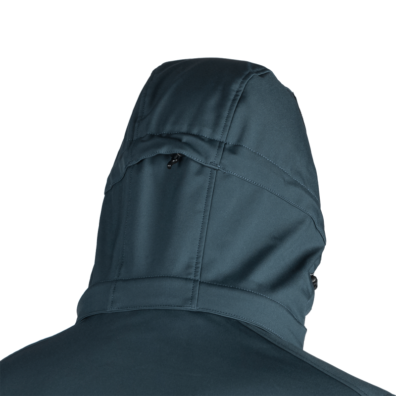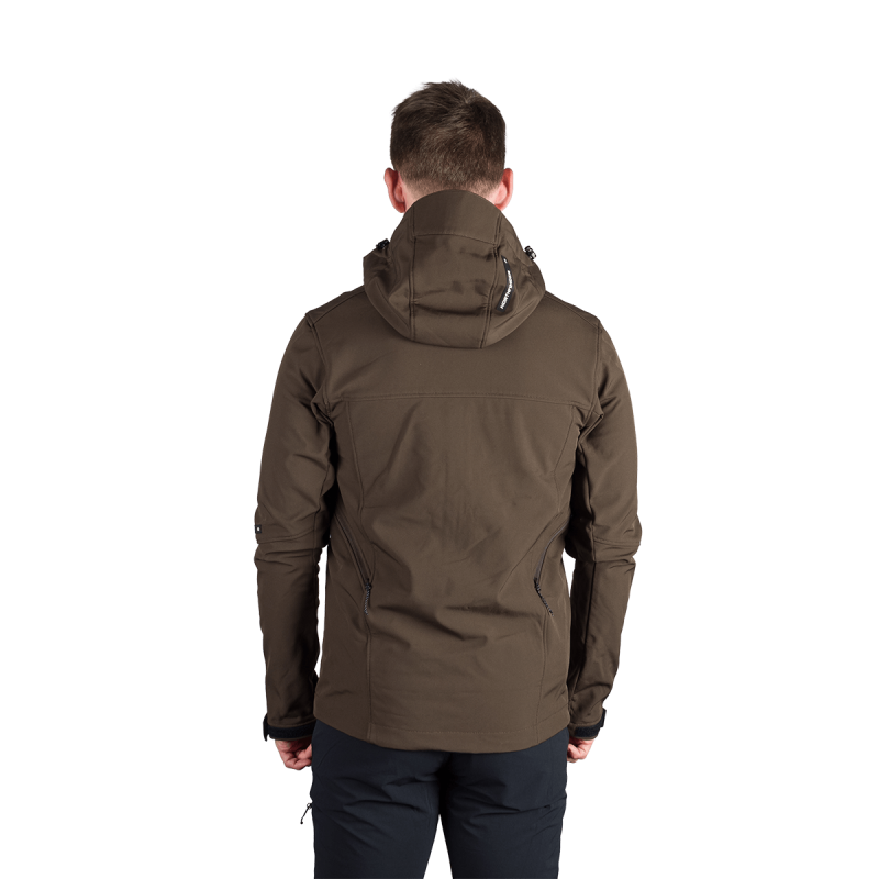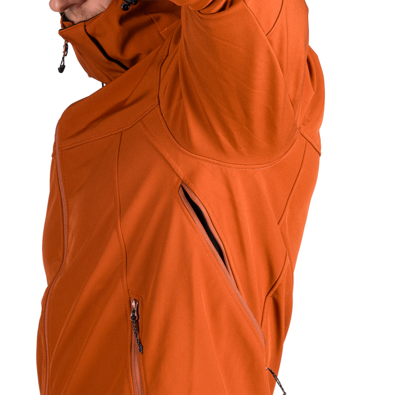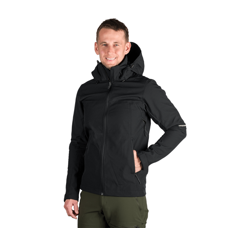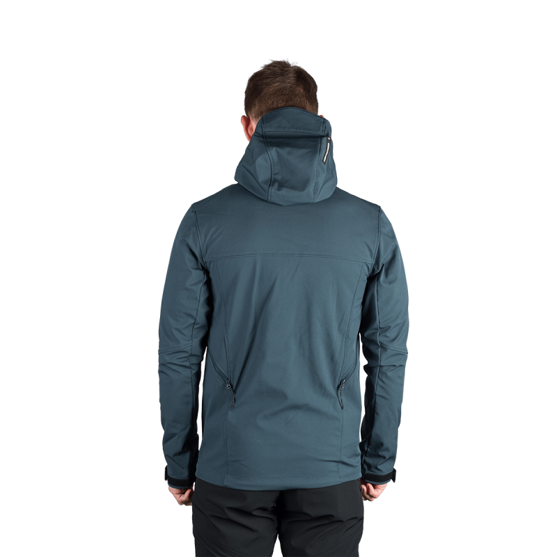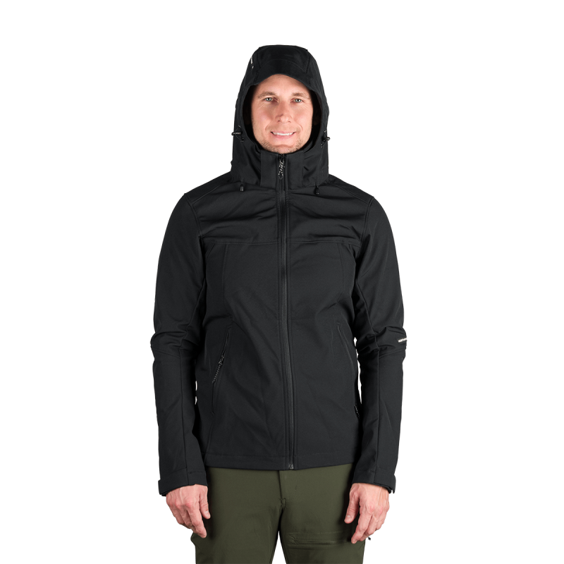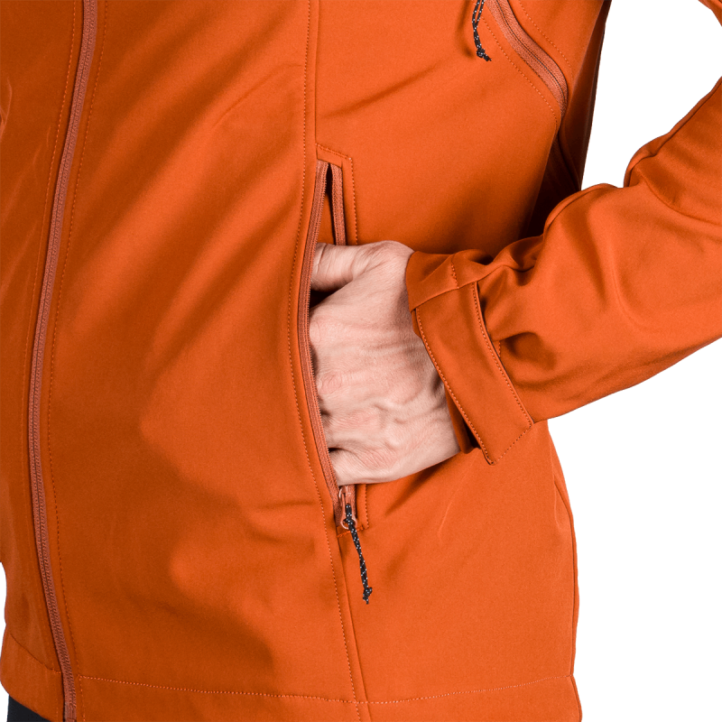 Bunda je vyrobená z prémiovej 3-vrstvovej softshellovej tkaniny pozostávajúcej z 92 % polyesteru a 8 % spandexu, čo zaručuje odolnosť a zároveň pružnosť. Vďaka 4-smernému elastickému materiálu a vodoodpudivej úprave bez PFC zodpovedá ekologickým štandardom. Tkanina dosahuje vodný stĺpec 5 000 mm a paropriepustnosť 5 000 g/m²/24 hodín, čo zabezpečuje optimálnu priedušnosť pri záťaži.