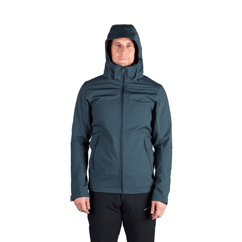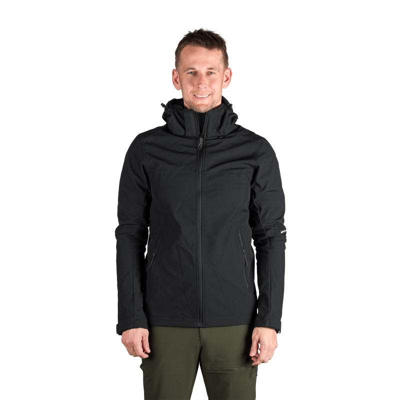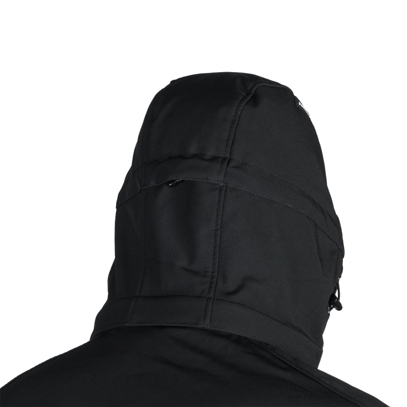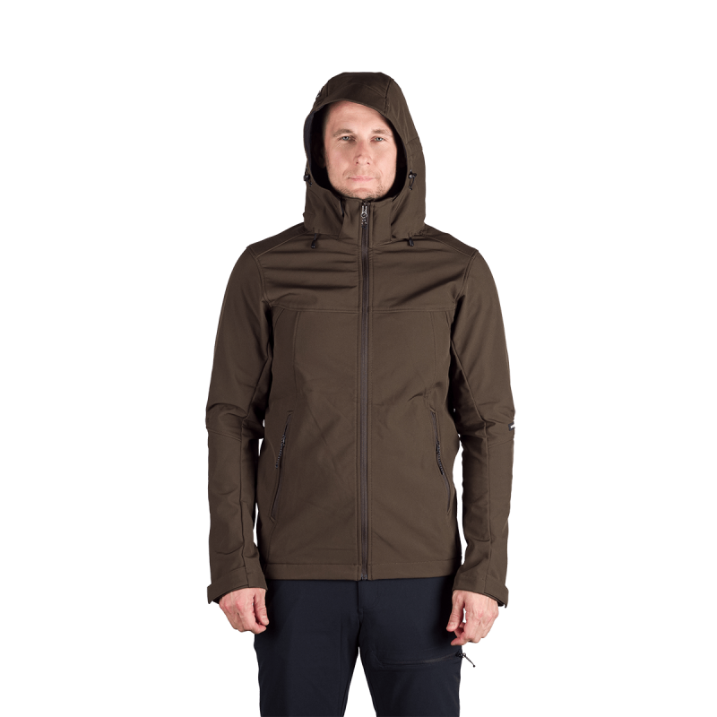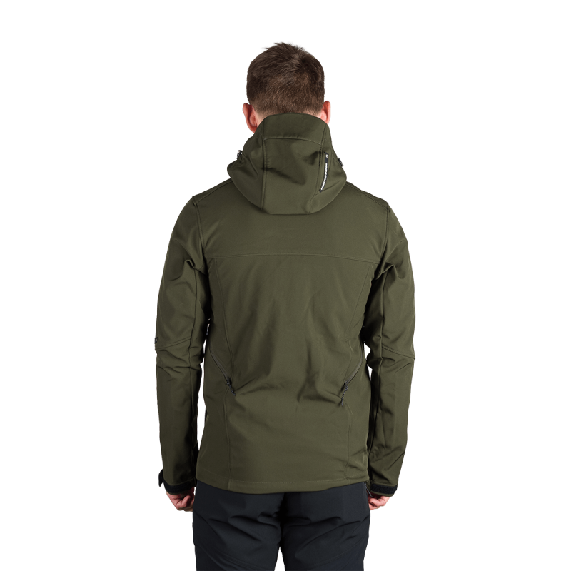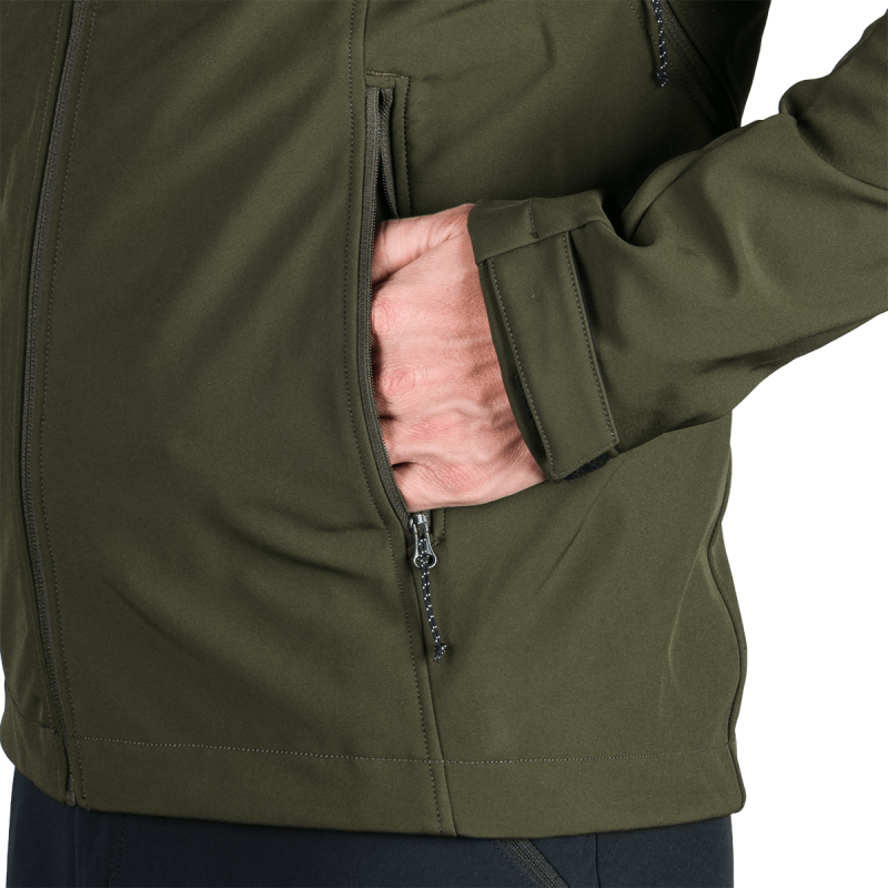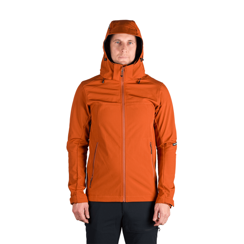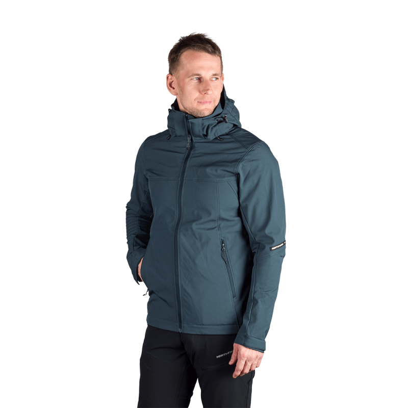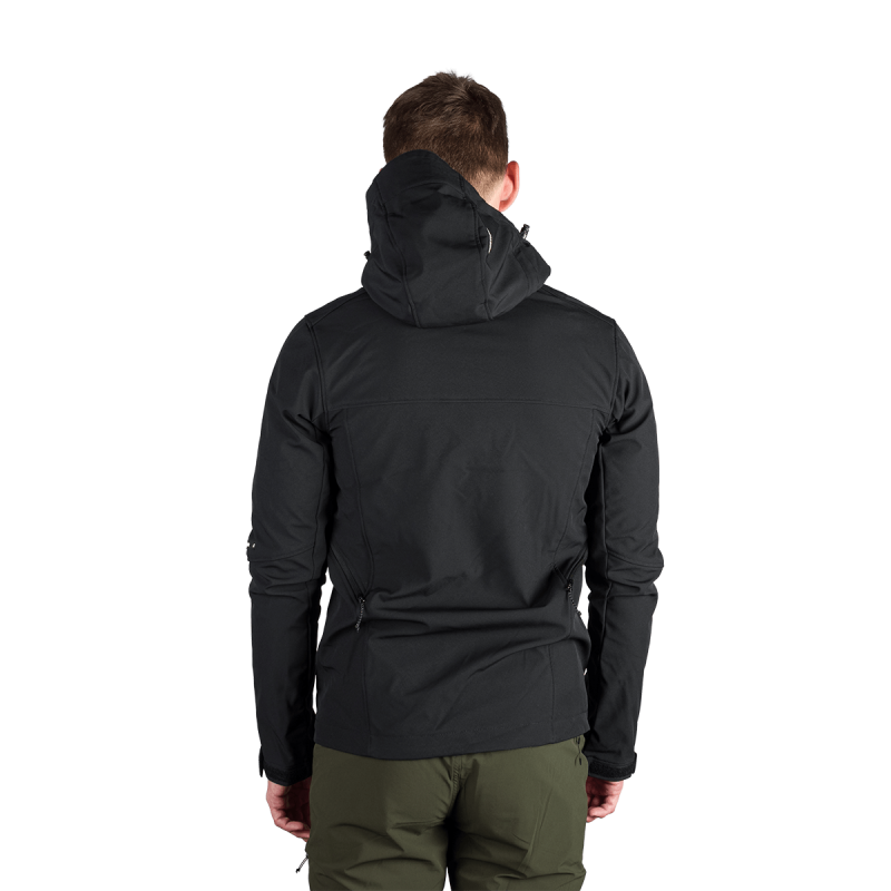 Bunda je vyrobená z prémiovej 3-vrstvovej softshellovej tkaniny pozostávajúcej z 92 % polyesteru a 8 % spandexu, čo zaručuje odolnosť a zároveň pružnosť. Vďaka 4-smernému elastickému materiálu a vodoodpudivej úprave bez PFC zodpovedá ekologickým štandardom. Tkanina dosahuje vodný stĺpec 5 000 mm a paropriepustnosť 5 000 g/m²/24 hodín, čo zabezpečuje optimálnu priedušnosť pri záťaži.