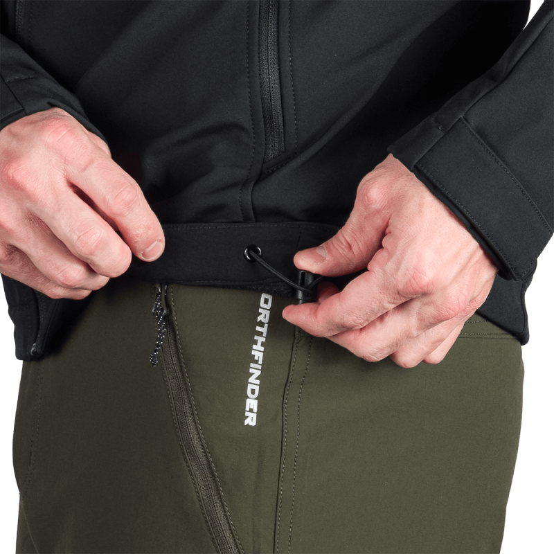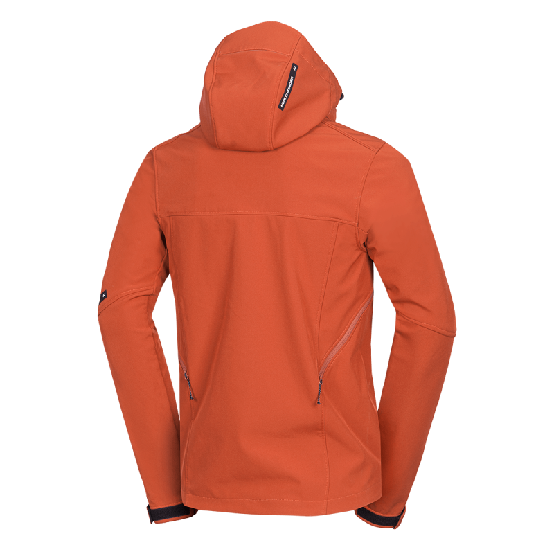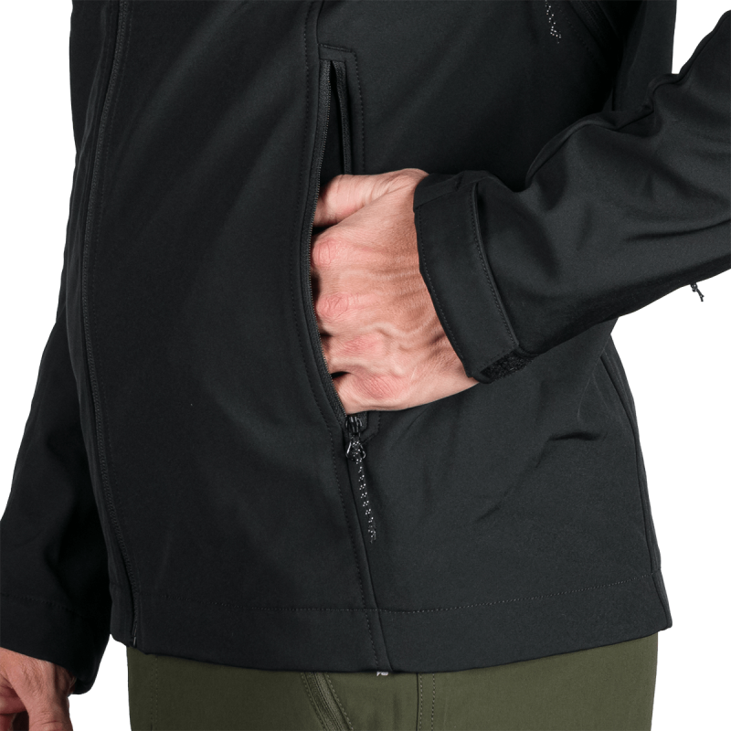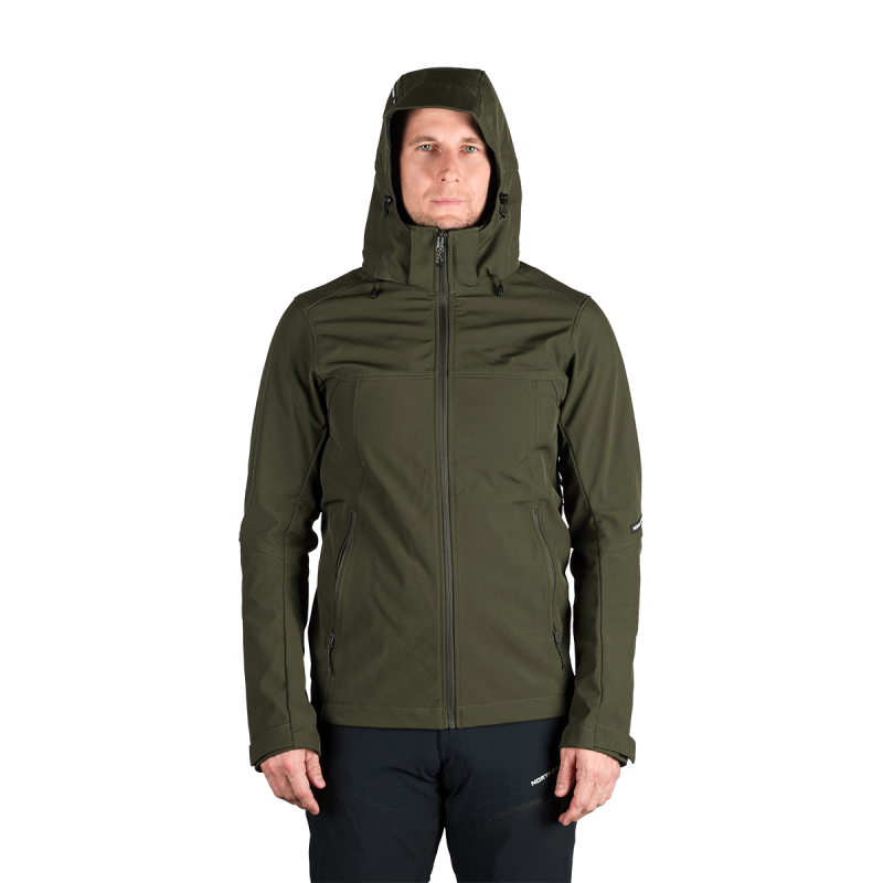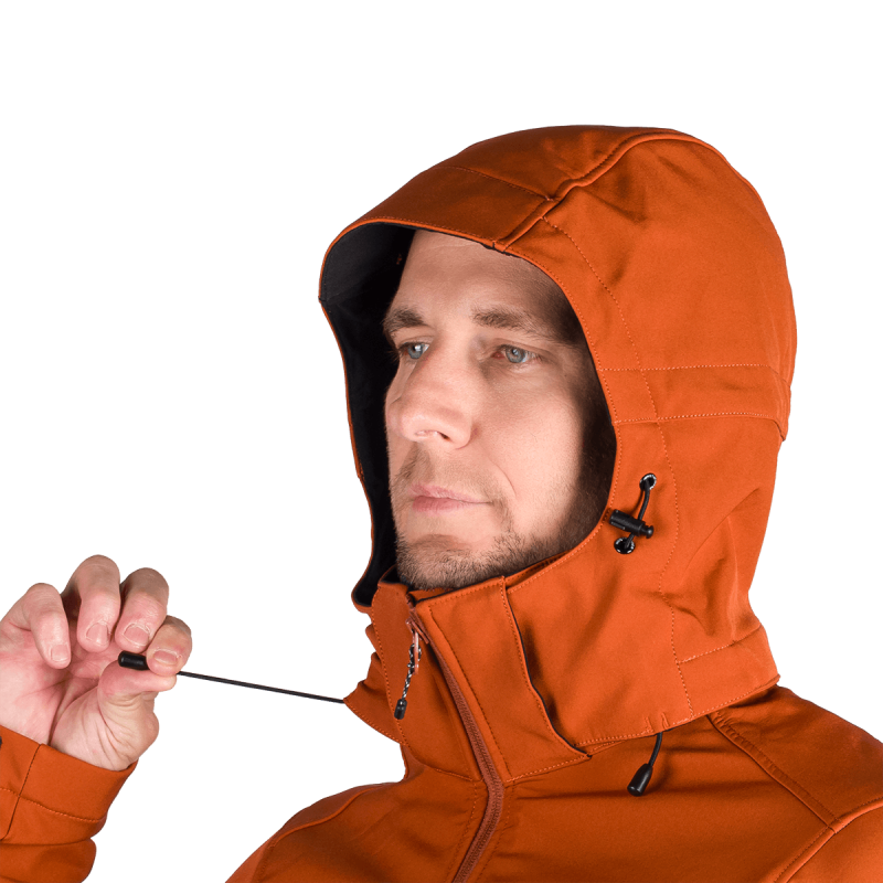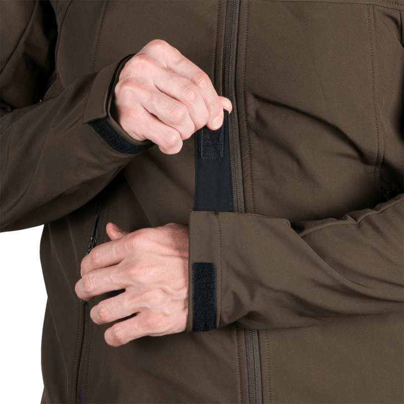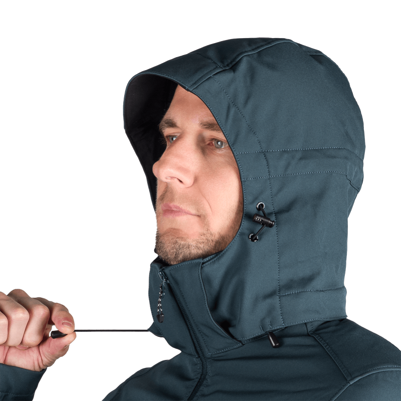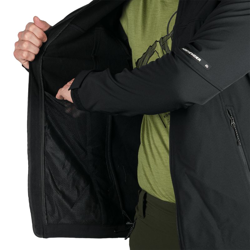 Bunda je vyrobená z prémiovej 3-vrstvovej softshellovej tkaniny pozostávajúcej z 92 % polyesteru a 8 % spandexu, čo zaručuje odolnosť a zároveň pružnosť. Vďaka 4-smernému elastickému materiálu a vodoodpudivej úprave bez PFC zodpovedá ekologickým štandardom. Tkanina dosahuje vodný stĺpec 5 000 mm a paropriepustnosť 5 000 g/m²/24 hodín, čo zabezpečuje optimálnu priedušnosť pri záťaži.