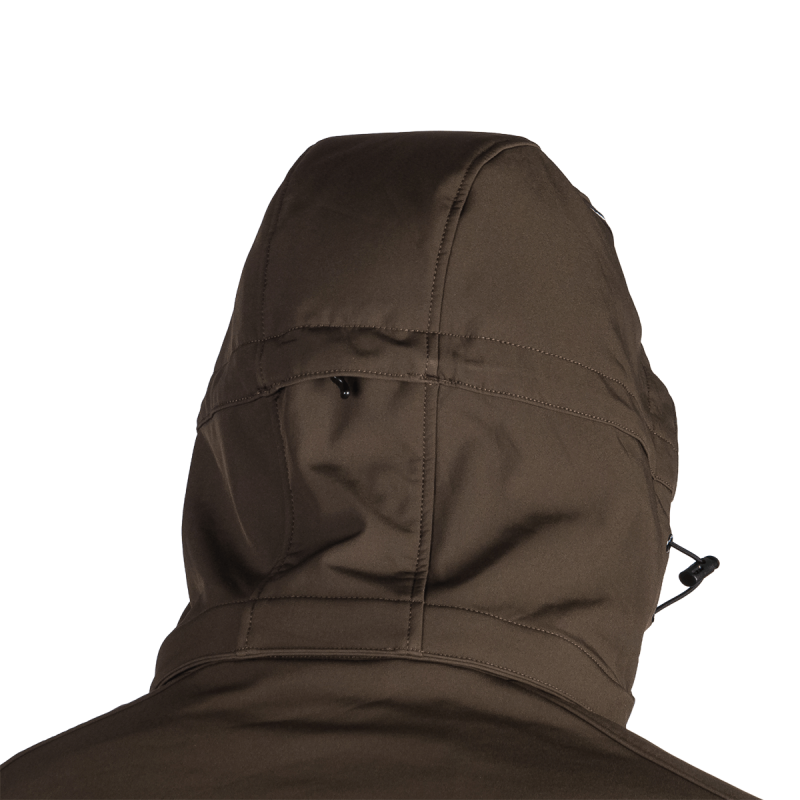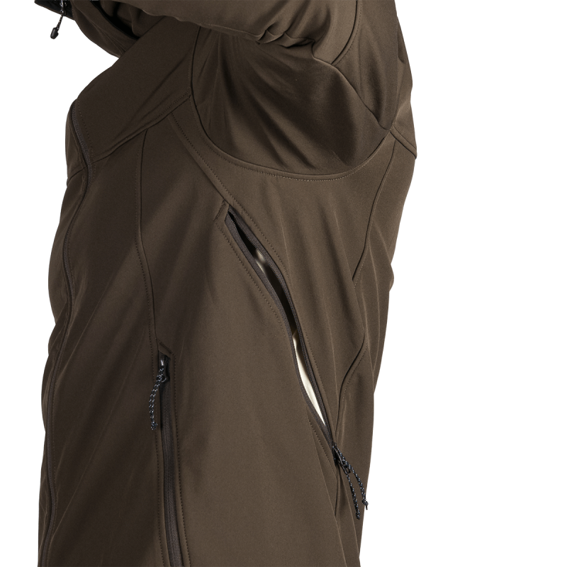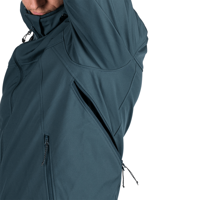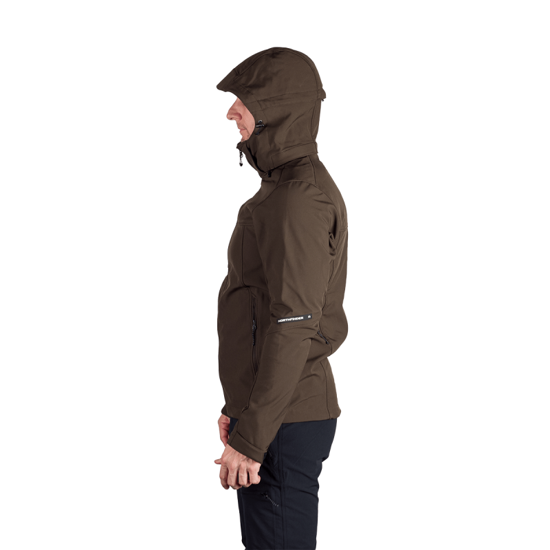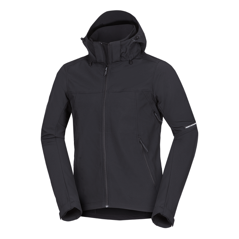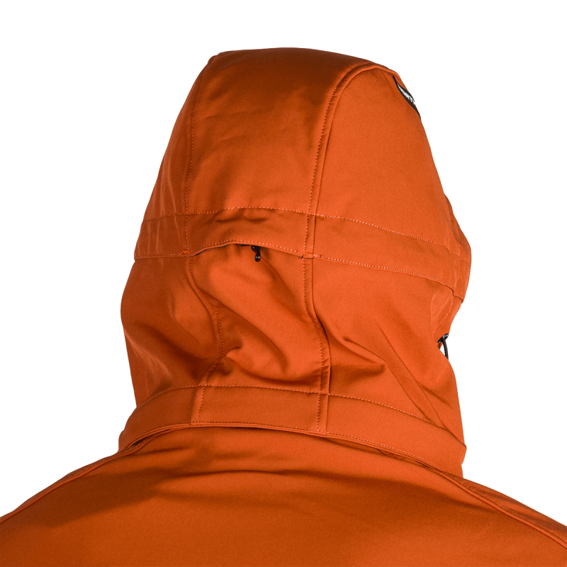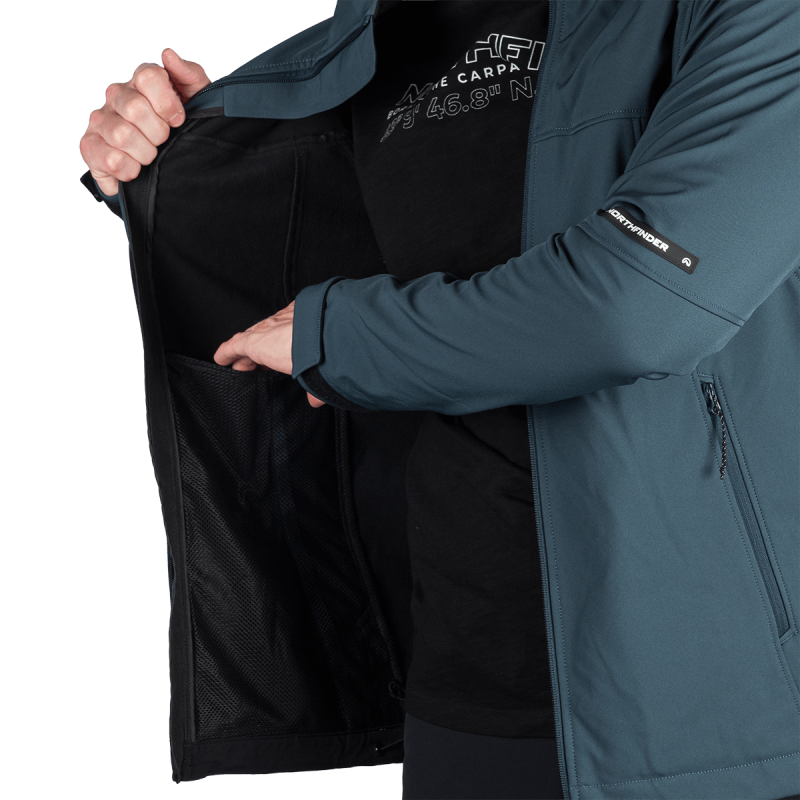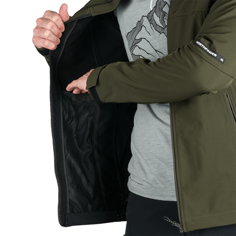 Bunda je vyrobená z prémiovej 3-vrstvovej softshellovej tkaniny pozostávajúcej z 92 % polyesteru a 8 % spandexu, čo zaručuje odolnosť a zároveň pružnosť. Vďaka 4-smernému elastickému materiálu a vodoodpudivej úprave bez PFC zodpovedá ekologickým štandardom. Tkanina dosahuje vodný stĺpec 5 000 mm a paropriepustnosť 5 000 g/m²/24 hodín, čo zabezpečuje optimálnu priedušnosť pri záťaži.
